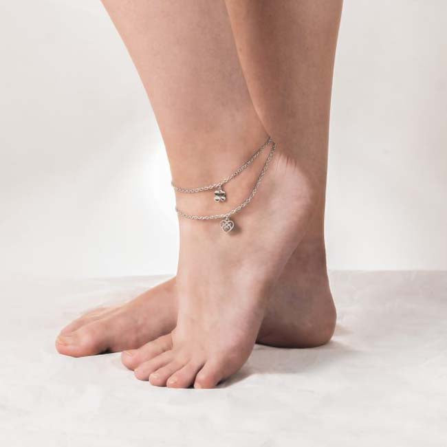 Naisten hopeinen nilkkakoru neliapilariipuksella. Herttainen hopeanilkkakoru, jonka pituus on säädettävissä omalle nilkalle sopivaksi, joko 23 cm tai 25 cm pituuteen. Hopeisen neliapilahelan koko on 10 x 10 mm. Ihana nilkkakoru tuomaan tai antamaan onnea! Mallilla on kuvassa nilkassaan sekä Onnekas-nilkkakoru että Lumoavan Helmi-nilkkakoru.