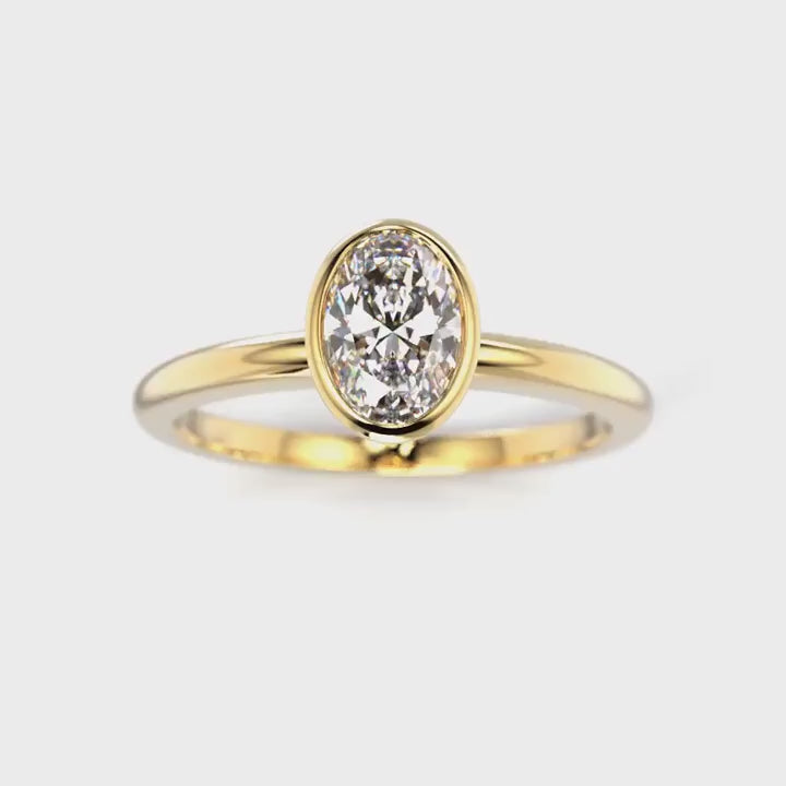 Trendikäs Aurea Bezel-sormus, jonka keskipisteenä loistaa ovaalihiottu timantti. Timantti on istutettu kauniisti ovaaliin Bezel kehään mitä korostaa sormuksen siro puolipyöreä runko.