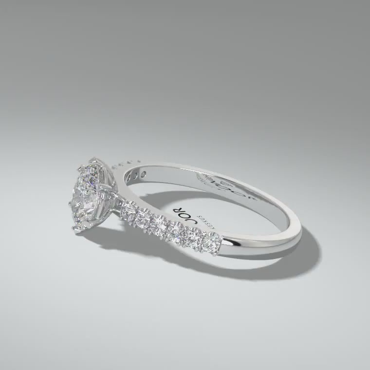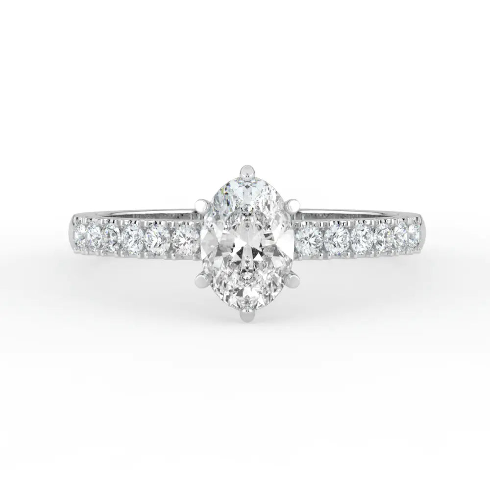 Kohinoorin Theia-solitairesormus ovaalilla laboratoriotimantilla ja sileällä rungolla. Yhden karaatin ovaali laboratoriotimantti on laadultaan G-Vs. Sormuksen runko on valmistettu 14 karaatin valkokullasta.