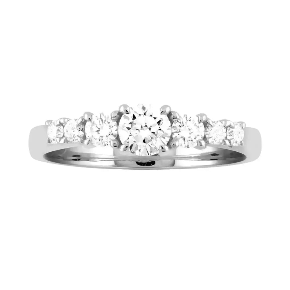 Näyttävän Taivaanranta V-397w sormuksen 7-kivisen istutuksen timanttien yhteispaino on 0,54 ct, keskikiven koko on 0,27 ct.